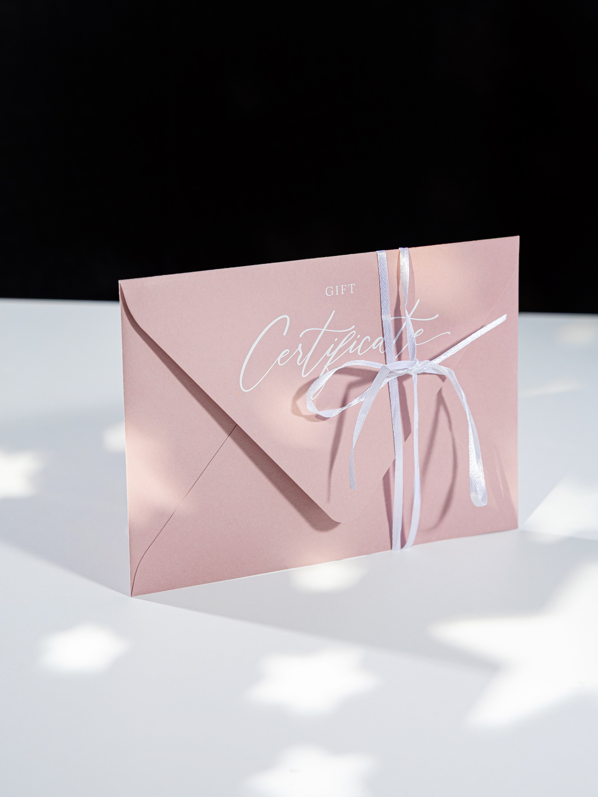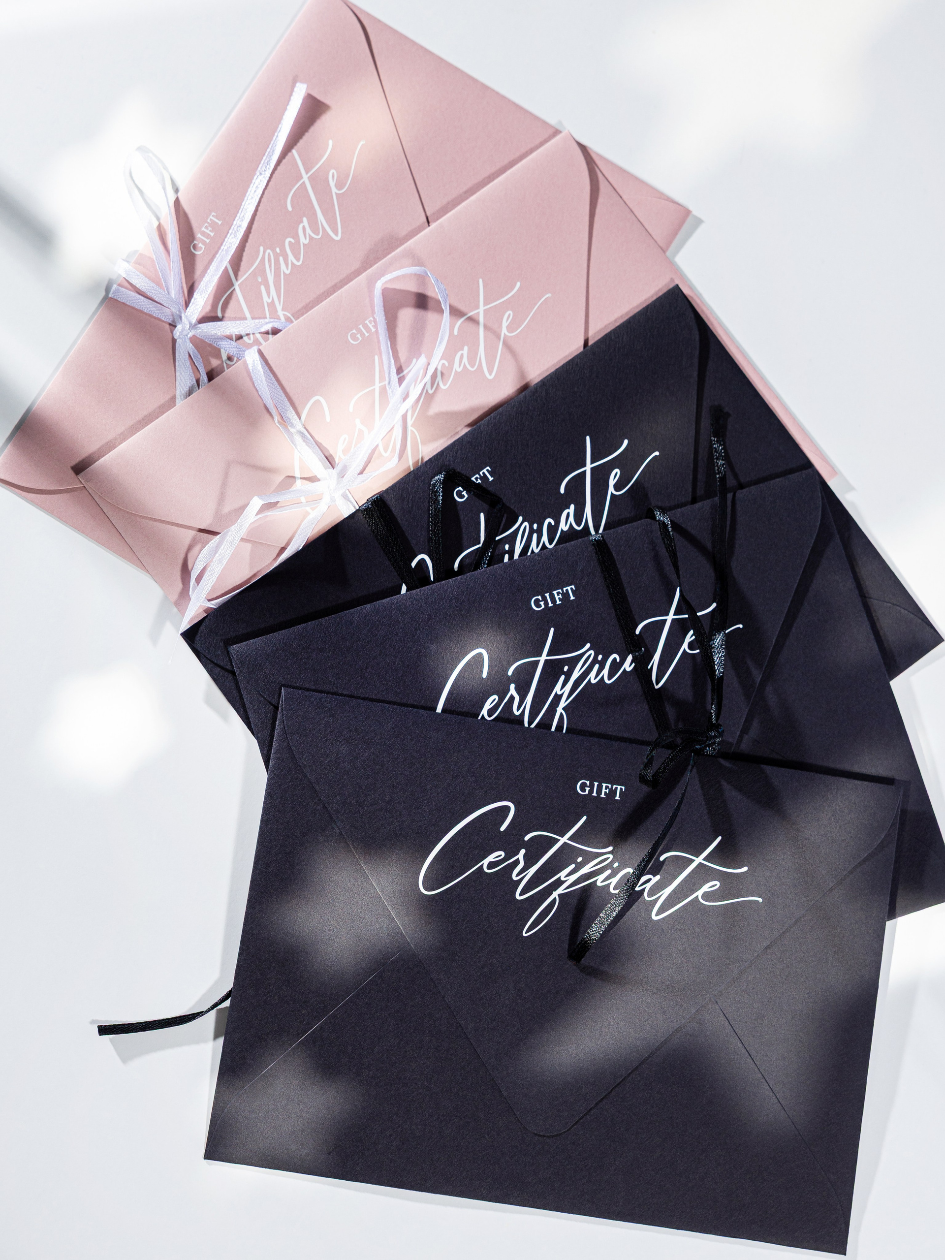 Подарочный сертификат на фотоессию выполнен в форм-факторе конверта с ленточкой и заполненным бланком внутри. Есть варианты в двух цветах черный и розовый.