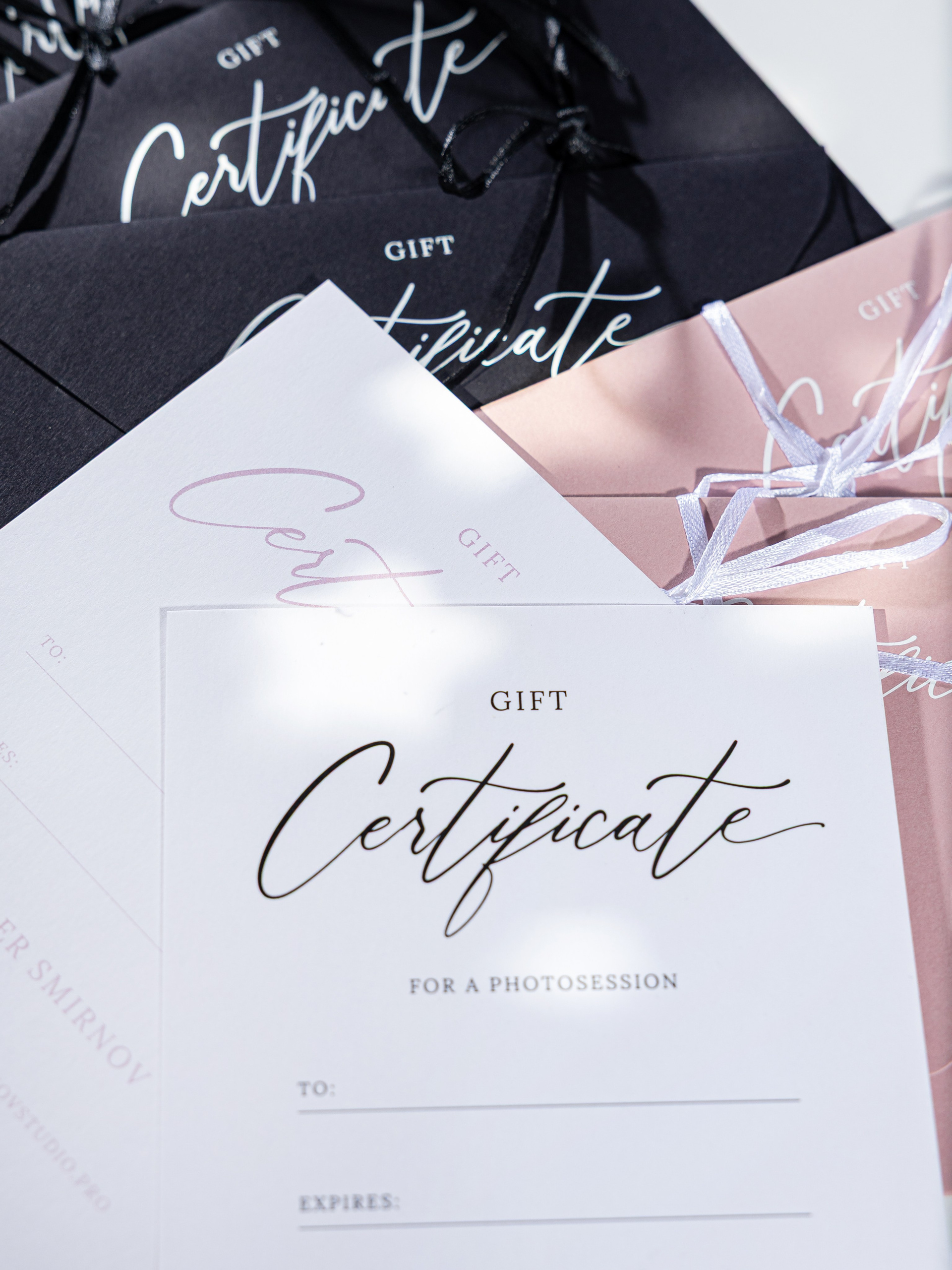 - Подарочный сертификат на фотосессию красиво оформлен и упакован в красивый праздничный конверт.
